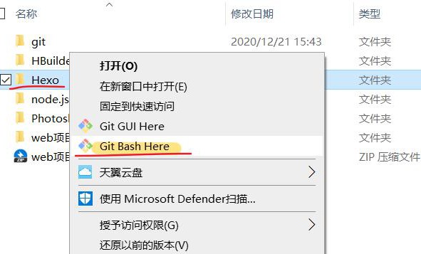 - 新建一个文件夹用来存放 Hexo 的程序文件,如 Hexo-Blog。打开该文件夹,右键 -> Git Bash Here。